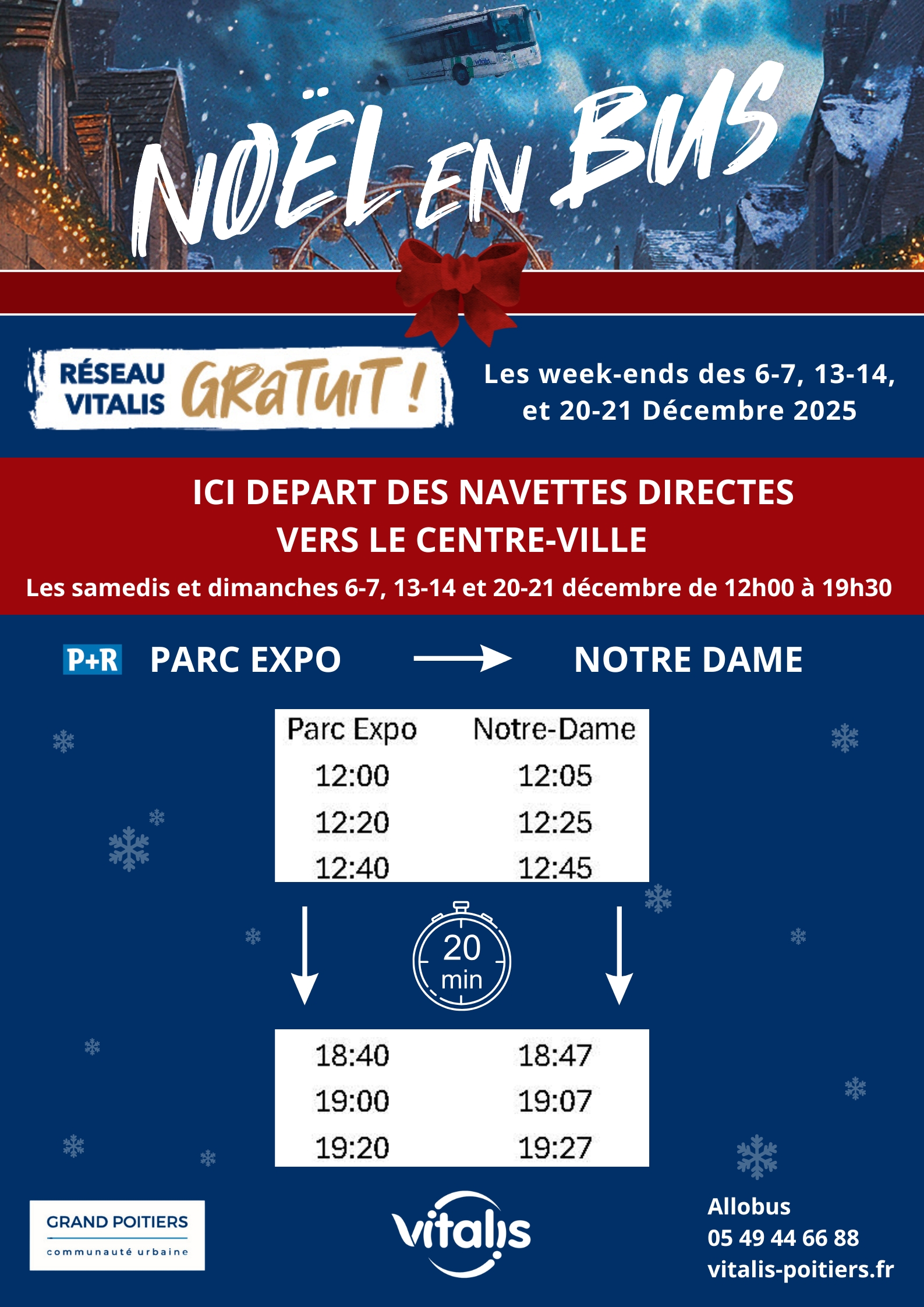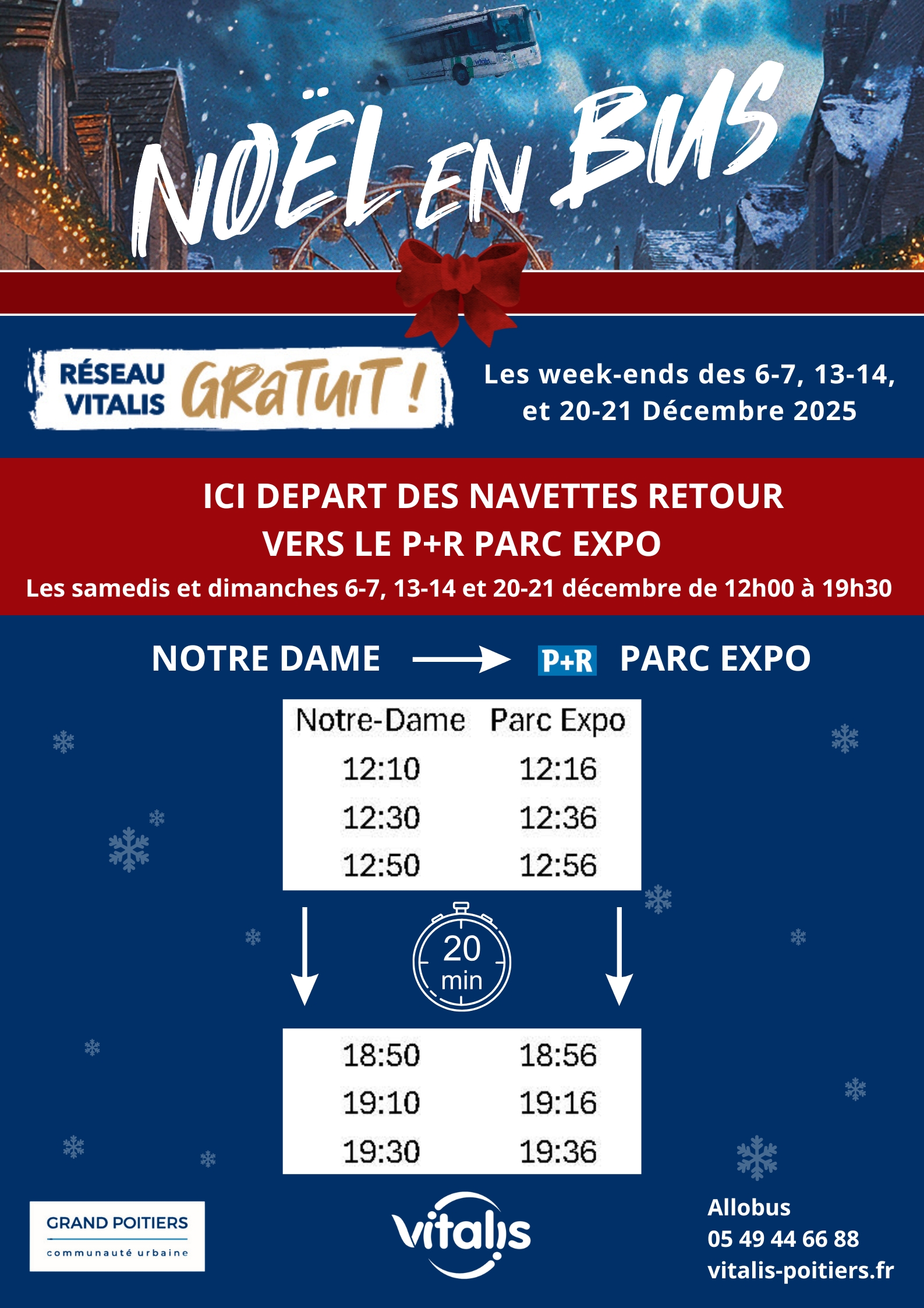 - P+R Parc Expo <> Notre-Dame : départ toutes les 20 min (horaires des allers–horaires des retours)