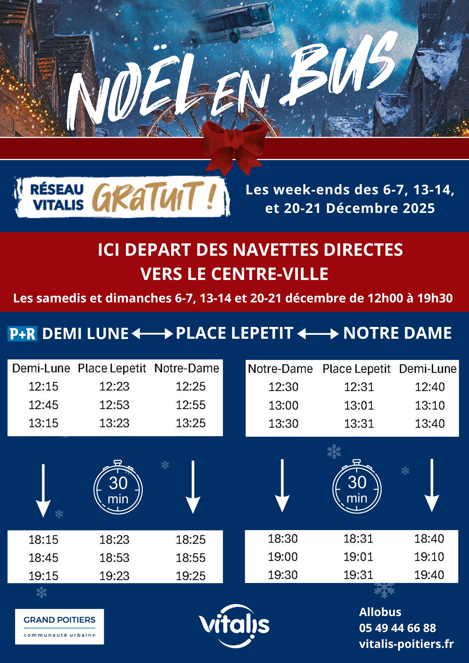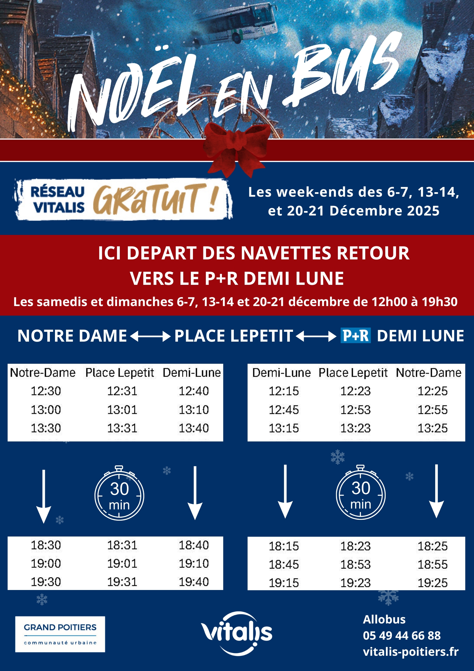 - P+R Demi-Lune <> Place Lepetit <> Notre-Dame : départ toutes les 30 min (horaires des départs–horaires des retours)